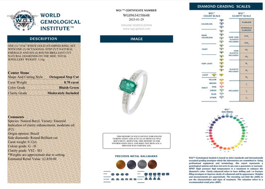 0.70 Ct Natural Emerald, 0.12 Ct Diamond Ring, 18K White Gold - WGI Certificate £2,850