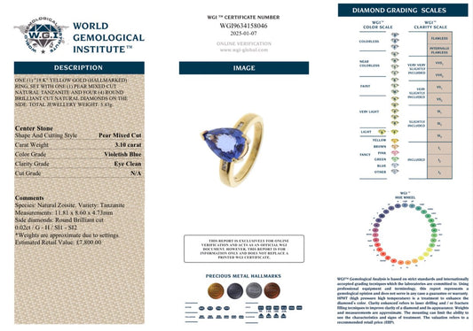 3.10 Carat Natural Pear Shaped AAAA Tanzanite and Diamond Ring- 18K Yellow Gold - WGI Certificate £7,800