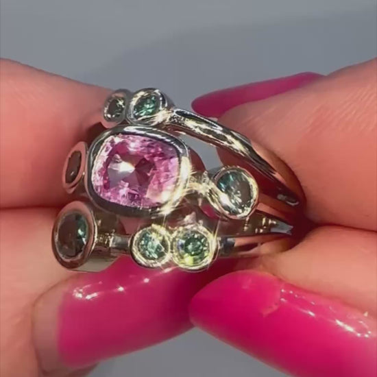 Handcrafted in luxurious 950 platinum, this artful sculptural ring centres around a 1.25ct natural pink sapphire in a cushion mixed cut — glowing with that soft, romantic Madagascar blush. Orbiting around it is Nikki’s signature cosmic cluster of seven round brilliant diamonds, totalling 0.55ct, including mesmerising fancy blue diamonds that give the whole piece a vibrant, modern edge.