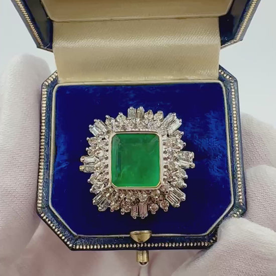 Set in luxurious 18K white and yellow gold (tested) and stamped, the ring features a magnificent 3.00ct natural emerald at its heart — beautifully octagonal step cut and displaying a rich, vibrant green hue. Surrounding the emerald are sixteen (16) baguette-cut and thirty-six (36) single-cut natural diamonds, creating a dazzling, layered cluster effect that radiates sophistication.