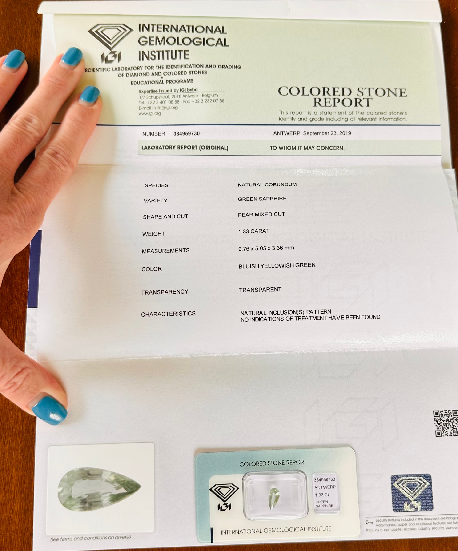This is a rare untreated sapphire with a unique and captivating bluish-yellowish green hue, offering both elegance and individuality. Its pear cut makes it perfect for a statement ring or pendant, and as an unheated sapphire, it sits firmly in the investment-grade gemstone category.